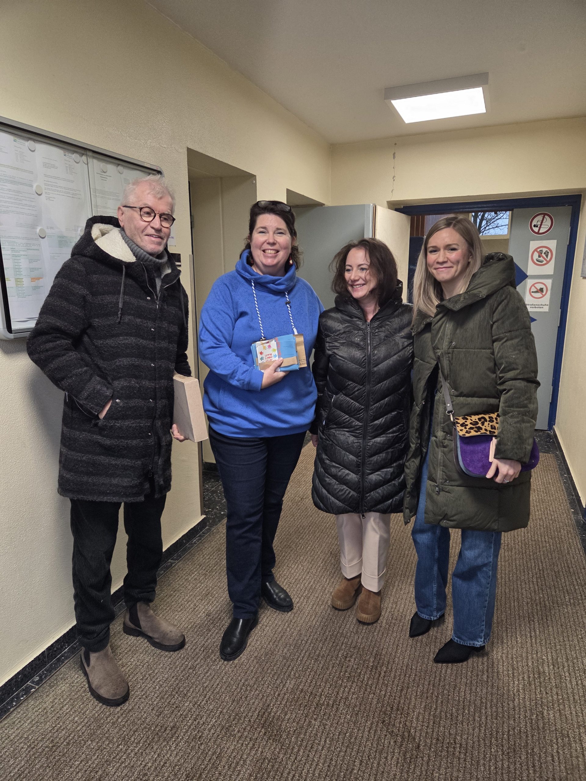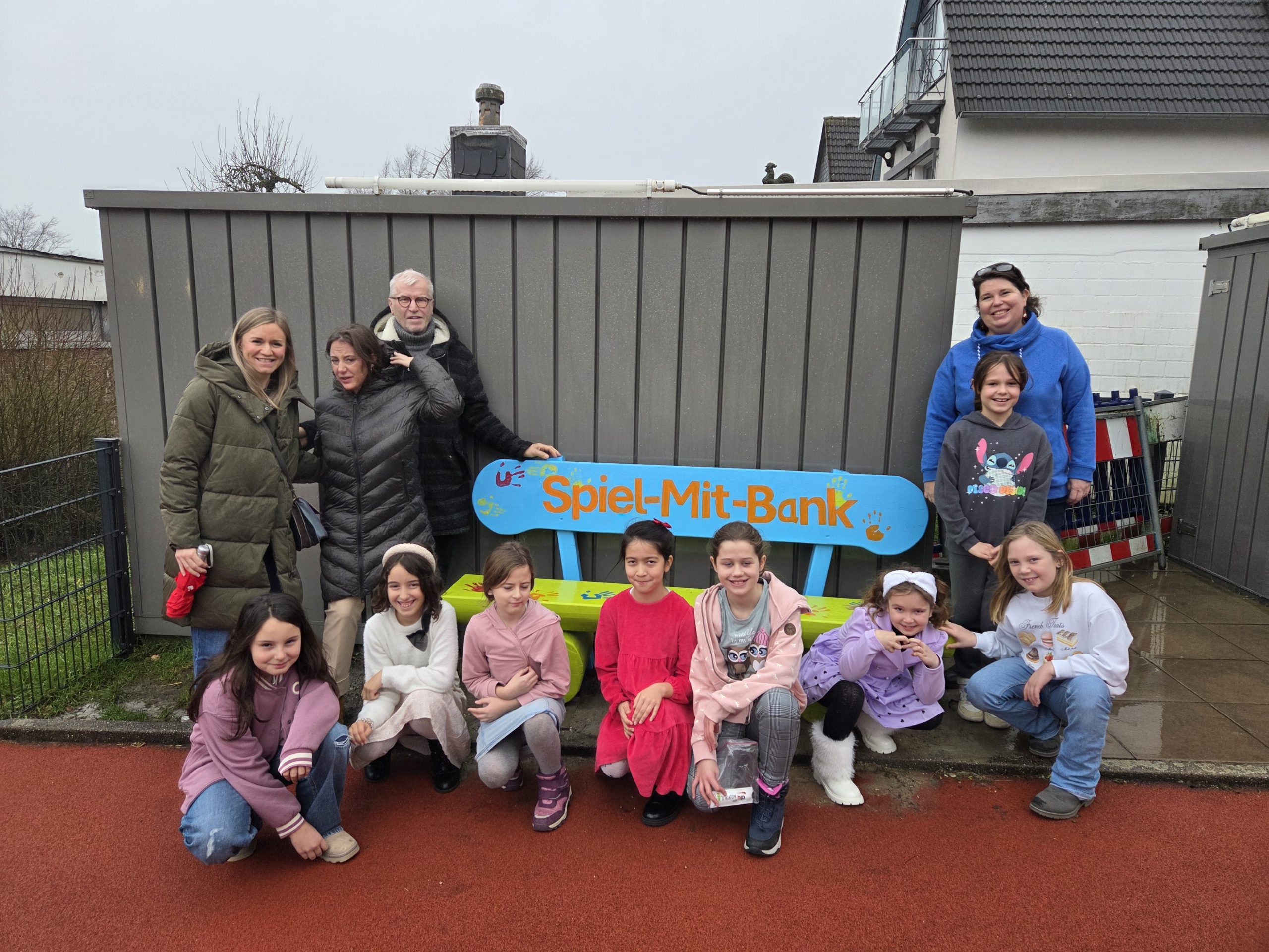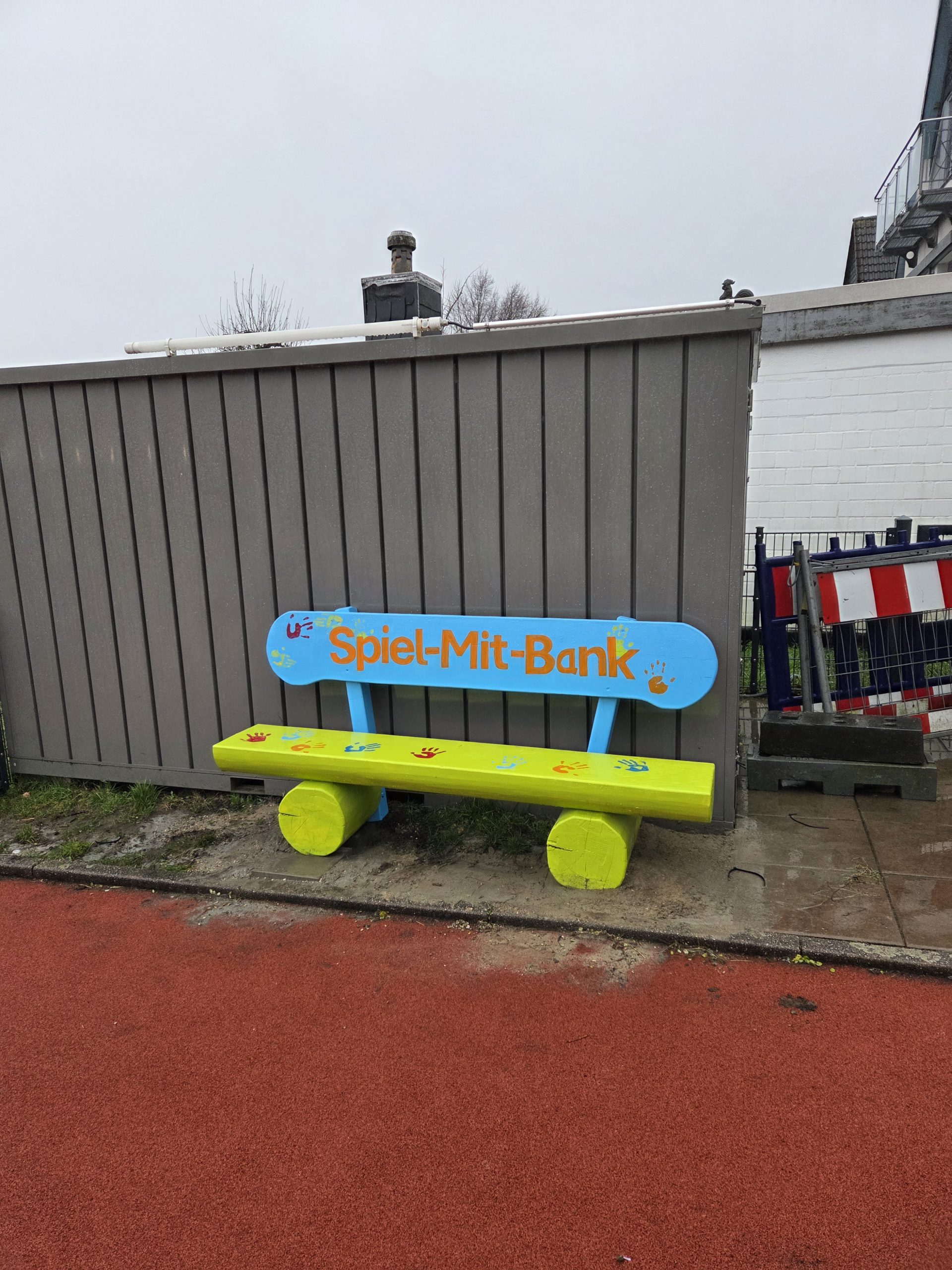 Auf die Frage von Schulleiterin Frau Jensen an die Schüler, wer denn die neue „Spiel-mit“-Bank schon gesehen hat, flogen alle Finger in die Luft – und das, obwohl die Bank erst im Frühjahr offiziell auf dem Schulhof aufgestellt wird.